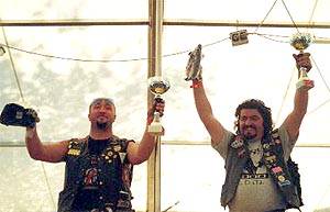Si iscrivono a tutti i giochi , braccio di ferro, tiro alla fune, spingere un barile con la moto,( si sa che l'unione fa la forza) insomma tutti i giochi di rito dei raduni, a un certo punto mi accorgo di parlare da sola, mi giro e vedo due "tizie" ultra compresse in corpetti fluorescenti.. non ho parole … di fronte a tanta grazia Anto stava li con la bocca aperta semi -incosciente sono andata li e…… asciugati sta saliva! Gli ho gridato… ma è stavo veramente difficile…., mi hanno iscritta come donna biker e io che mi ero messa la maglietta dei Netbiker ho pure vinto un premio, (incredibbbbbile) una coppa e un giubbotto in pelle, poi come se no bastasse Anto e Luca hanno vinto altri premi.
